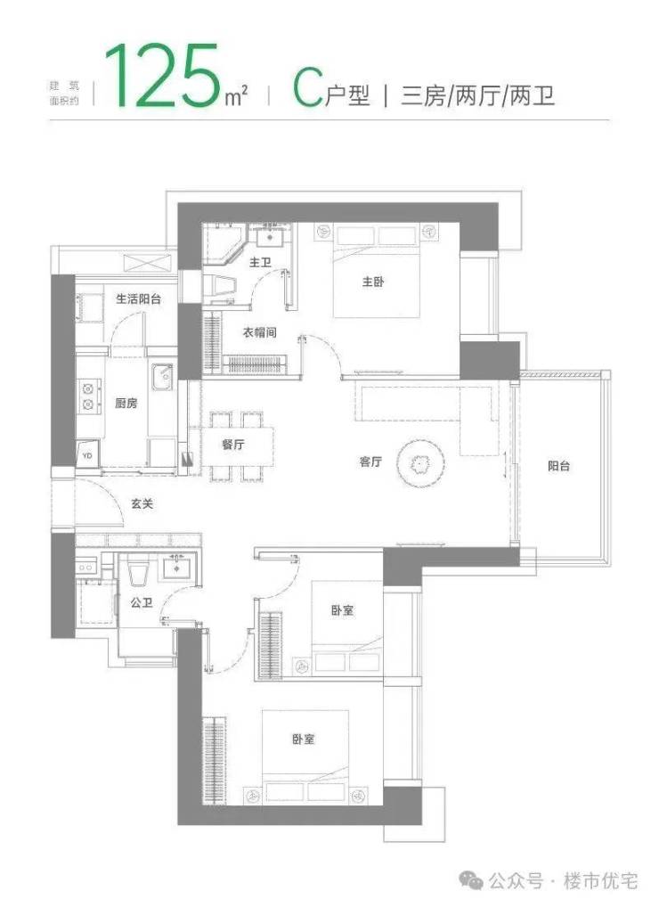 C户型 建面约125 m² 三房两厅两卫
