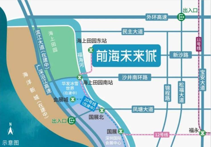 卓越前海未来城,家门口就是12号地铁线“海上田园东站”,一期是最靠近地铁站的,2站到国展北站可以换乘20号线,6站到福永站还可以换乘11号线,快速通达宝中,南山区。