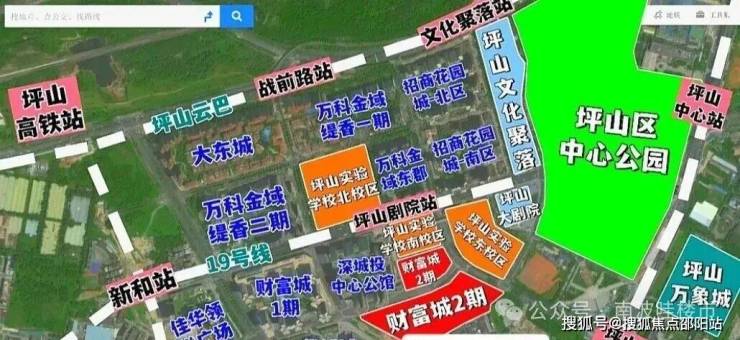 财富城2期所在的区位是整个坪山最核心的地段,汇聚了高铁+14/16号线双地铁+坪山实验学校+坪山中心公园+坪山天虹商场+坪山区政府+坪山体育中心+坪山图书馆,文艺馆等等,所有的市政配套基本都集中在这里,并且财富城2期也是该核心区域内唯一在售的新盘。