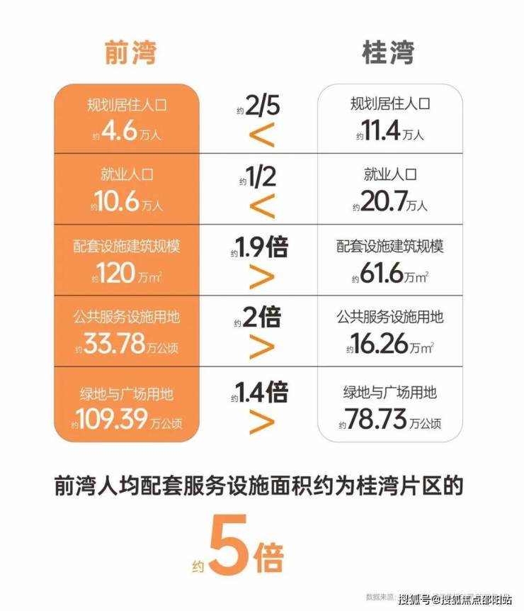 按照居住人口计算,前湾人均配套服务设施面积约为桂湾片区的5倍。这意味着,前湾的居住人口能享受到更丰富的配套服务。(数据来源:深圳前海管理局官网 摘录时间:2023年4月)