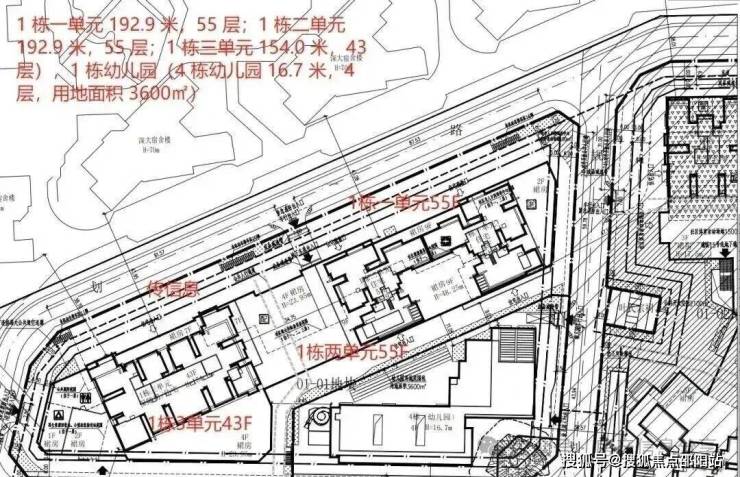 本期先推出的是02 地块,01地块规划总建面约17万㎡(住宅建面约8.9万㎡,商业建面约3.2万),容积率达9.0。由2栋(1栋1、2单元)53层、1栋(1栋3单元)43层的超高层塔楼和1栋幼儿园组成。