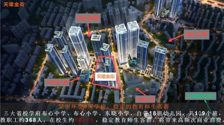 三大省校学府布心中学、布心小学、东晓小学,自带18班幼儿园,共109个班,教职工约368人,在校生约5754人,稳定教育师生客群,将带来高频次商业消费。