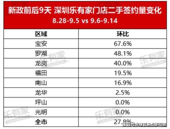 而中介机构则统计了深圳新政后9日的数据,即9月6日~9月14日,全市二手房签约量环比增长27.8%。其中,宝安、罗湖、龙岗的二手房签约量位居前列。
