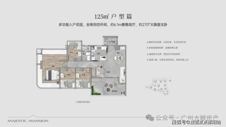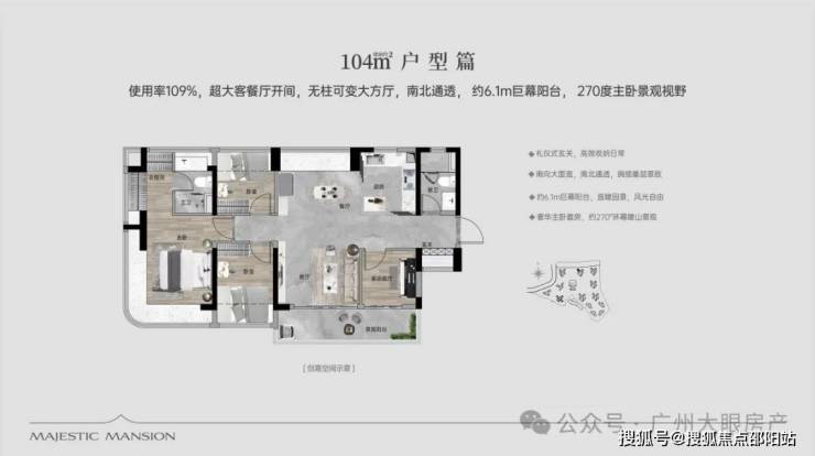 【100㎡四房两厅两卫】:西南向,使用率109%,南北通透,约6.1米巨幕阳台,主卧270°主卧弧形玻璃幕窗。