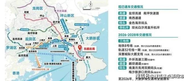 公路网络: 从项目出发通过迭福路——坪西路——惠深沿海高速——滨海大道实现 50 分钟可达罗湖中心 ,一小时可达福田中心。环大鹏湾海岸公路总长25.5公里。沿途的美景有揹仔角沙滩、玫瑰海岸、新 兴的民宿小镇官湖、金沙湾等。因一路山海美景被誉为“深圳最美公路”。