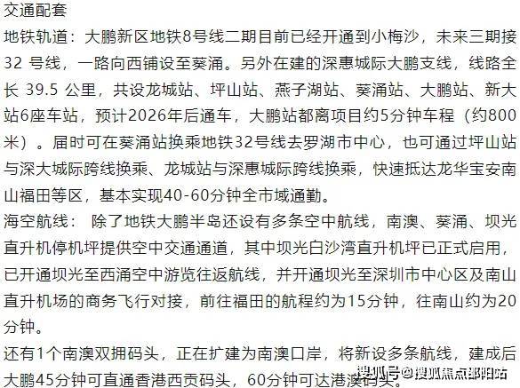 教育配套: 大鹏新区为进一步打造教育强区, 积极探索合作办学新模式,先后引进红岭、深中等优质资源合作办学,推动成立鹏城教育集团。