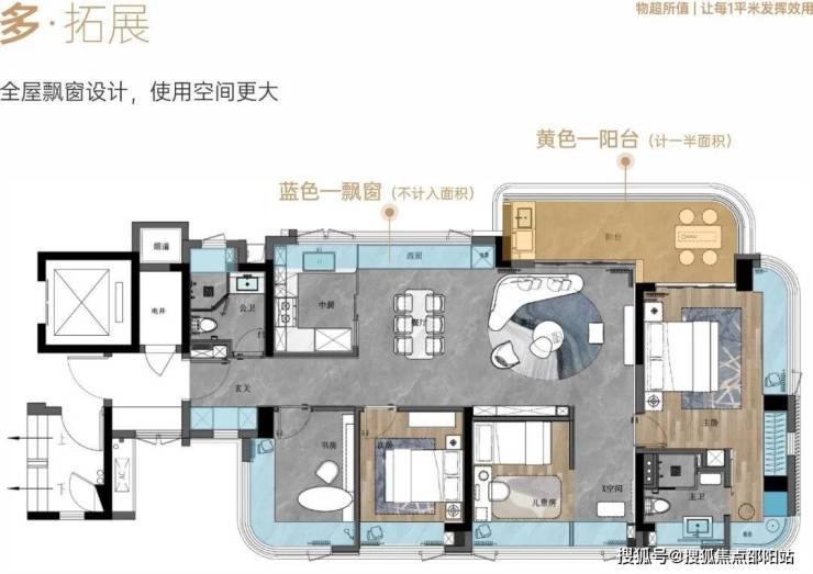 270°环幕转角水岸阳台,最大进深可设置茶台或棋牌桌,吹着海风、看着河景和家人一起喝茶聊天,乐享生活N种乐趣。