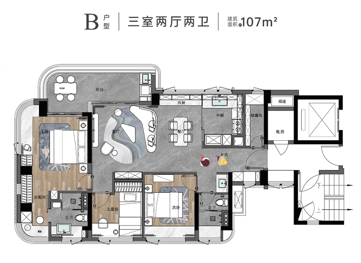 考虑到不同人群对于居住使用需求的不同,约 107 ㎡的户型我们做了横厅三房的设计。