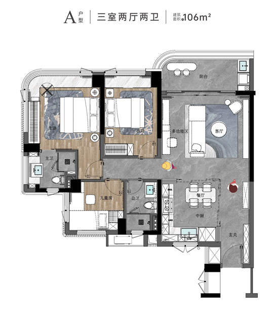 经深度研究发现,三房户型的黄金面积应该设定在约 106 ㎡,均衡性非常好,每个功能空间都有刚好的舒适度。