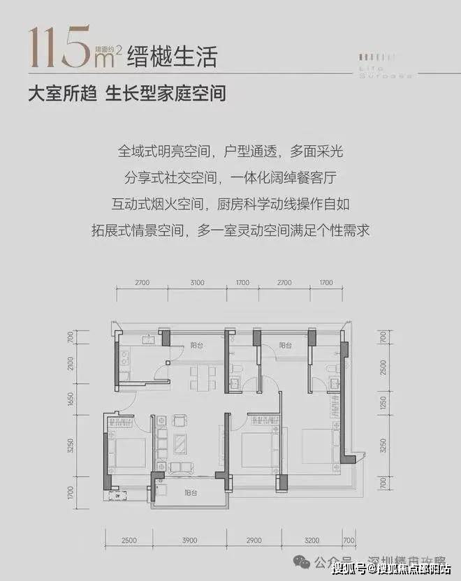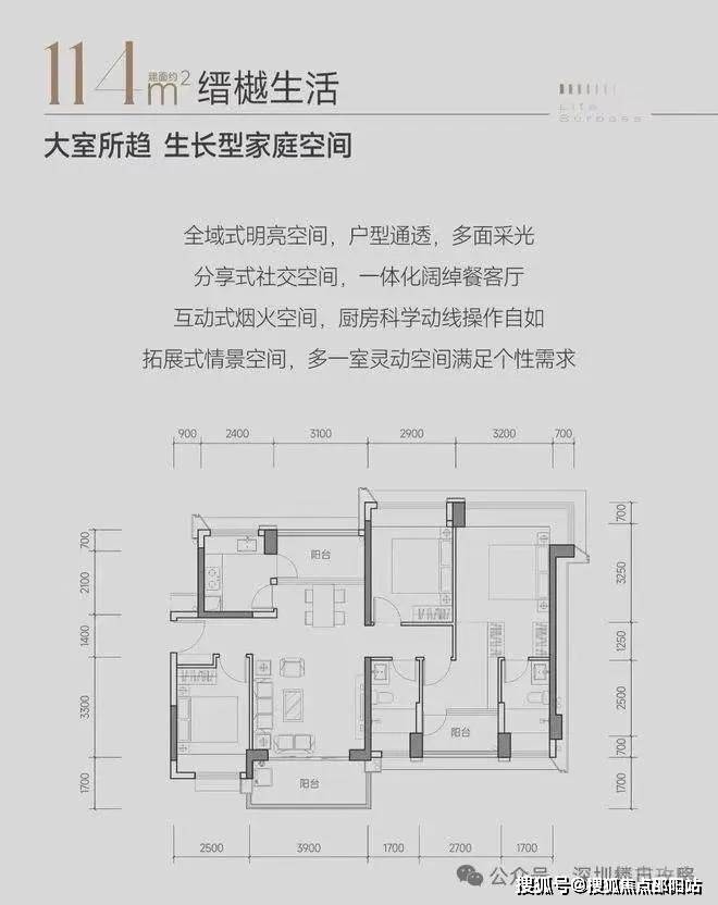 缙樾府的户型包括建面约 114㎡四房两厅一卫、约 115㎡四房两厅两卫、约 118㎡四房两厅两卫、约 133㎡五房两厅两卫。整个项目只有 2 栋相同平面的 100 米高纯商品住宅,十字型平面布局。114 - 115 - 118㎡四房各两条腿、133㎡五房 2 条腿,东南、西南朝向。全部为南北通户型,十字型布局使得户型采光通风非常好,但缺点是会有对视的情况存在。每户都存在通过阳台改造赠送的空间,改造后使用率基本接近 90%,属于市场上高拓产品。