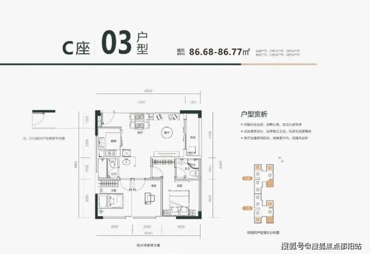 C03户型:约86㎡全能大三房,南北通透 + 全明格局