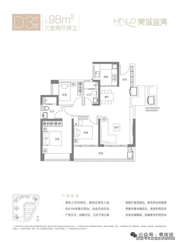 98㎡的3房2厅2卫,D1户型,经典竖厅格局,客厅3.7米开间,LDKB一体化设计,S墙设计预留冰箱卡槽位,动静分区,客厅连接次卧出6.5米长的大阳台,U型厨房,卫生间干湿分离,得房率约80.12%(不含赠送),西南或东北朝向。