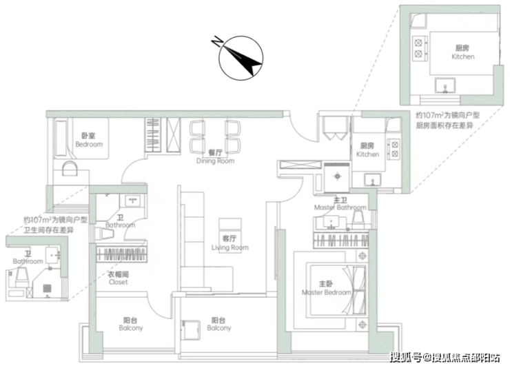 低区04户型,105-108㎡,朝向西南,双龙抱珠,两房两卫,三房需将一个阳台改房间,改后客厅面积小: