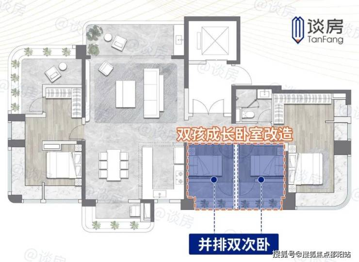 中间并排双次卧,可打通改为一个大空间,两娃小时一起生活,方便家长照看,长大后拥有专属独立空间,生活上互不相扰。