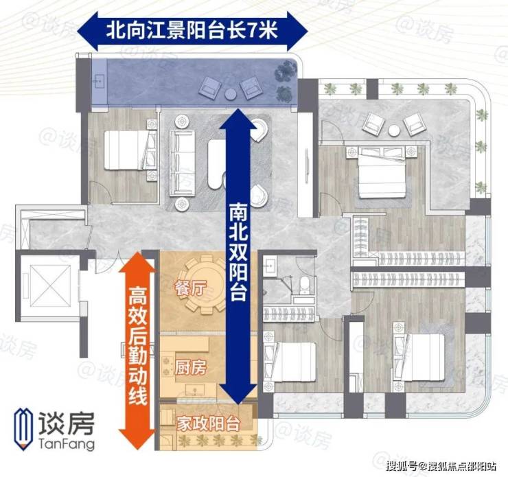 又如南北双阳台,北向阳台为休闲娱乐空间,南向家政阳台和厨房、餐厅相连,形成高效便捷的后勤动线。