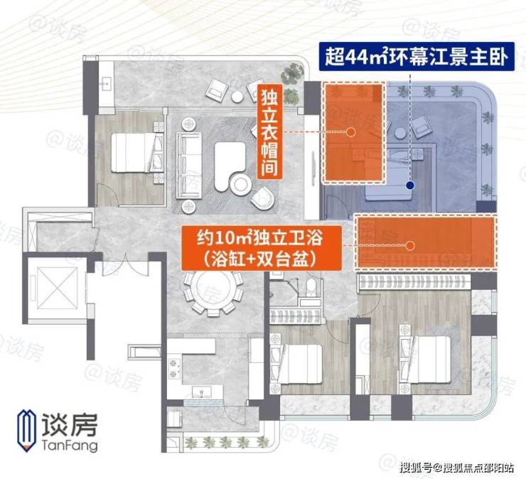 再如双套房设计,面江侧的主卧套房超44㎡,规划了宽敞的床区、独立衣帽间,约10㎡卫浴内,配置了高奢酒店标配的浴缸、双台盆。