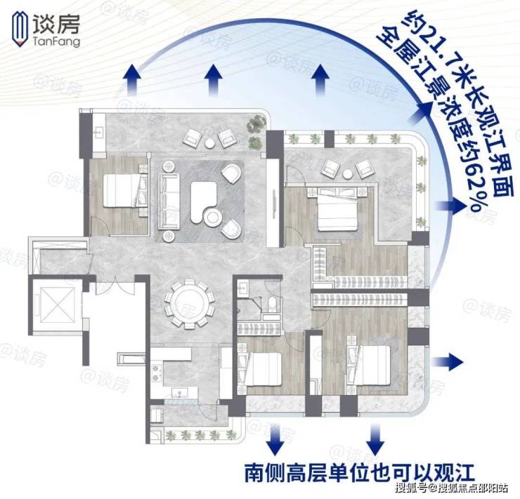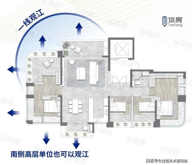 更绝的是,高层单位南侧也能看江,全屋被江景包围,堪称全景舱!