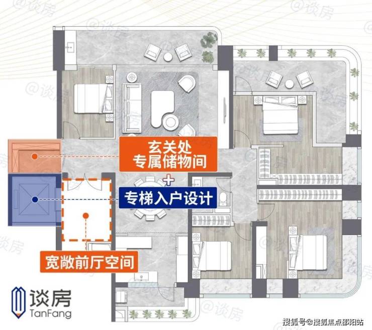 我惊喜发现,专梯入户竟是每户标配。这意味着敞阔的前厅空间可为已所用,鞋柜、换鞋凳一一安排!