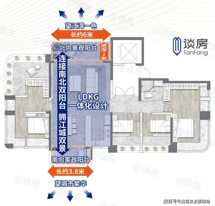 LDKG一体化客厅公区,连接南北双阳台,南向家政阳台望城市繁华,北向景观阳台赏江湾一色。