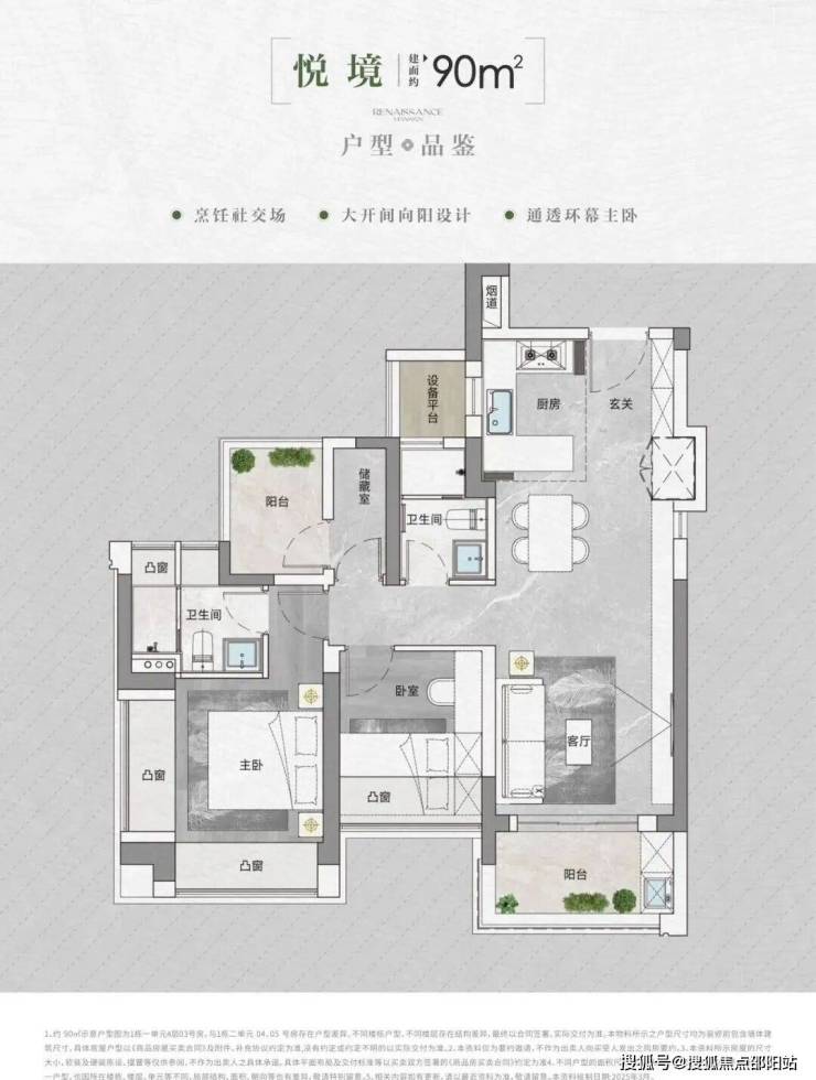 90㎡的3房2厅2卫,设计的是经典竖厅格局,进门入户玄关,LDKB一体化,S墙设计预留冰箱卡槽位,三开间朝南,U型厨房,卫生间干湿分离,还带1个设备平台,得房率约94.1-95.74%(包含赠送),西南朝向。