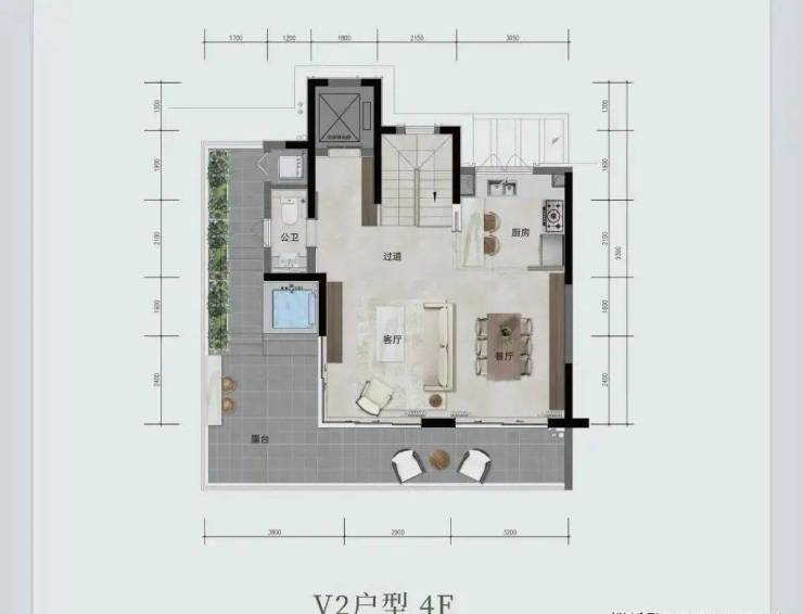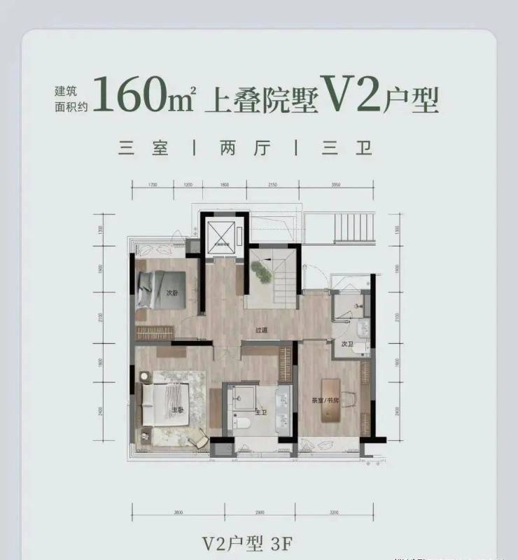 上叠院墅 V2 户型,约 160㎡(或 158.1㎡ ),三室两厅三卫。有私人电梯、双重玄关,约 6.1 米度假观景横厅,270° 三面采光 。约 30㎡L 型花园露台,能欣赏 270° 环幕景观。主卧奢阔,配备步入式衣帽间与独立卫浴,还有可拓展空间随心改造。