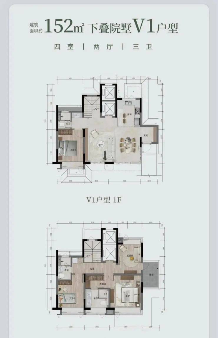 下叠院墅 V1 户型,约 152㎡(或 151.4㎡ ),四室两厅三卫。配备私人电梯、双重玄关入户,从地下车库可直达。约 6.7 米奢阔度假横厅,约 40㎡会客空间 。还有私家花园露台,主卧是酒店行政套房式设计,还有多重可拓展空间。
