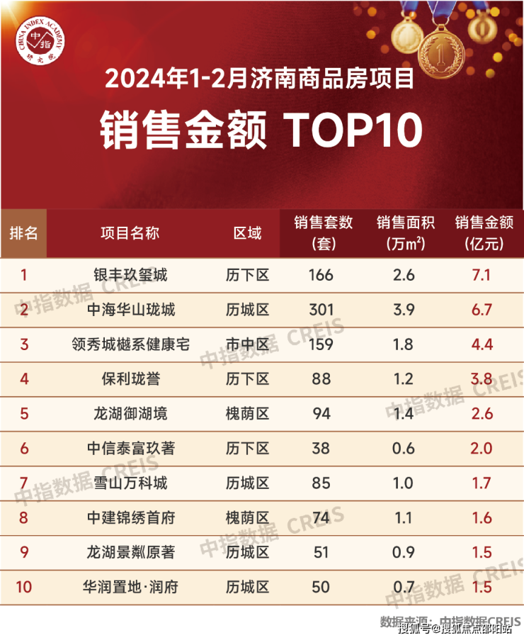 房企排行榜特别声明:房地产企业销售数据统计是以2024年1-2月销售的商品房为统计口径,项目销售数据以商品住宅为统计口径,主要依据中指数据CREIS(点击查看)在济南的销售监测数据,并同时参考企业提供的相关数据,对少数没有在监测范围内的项目,由企业提供相关文件,经审核,也纳入统计范围,集中网签的已售罄项目不纳入榜单。本报告仅供参考,不对使用报告及其内容所引发的任何直接或间接损失承担责任。