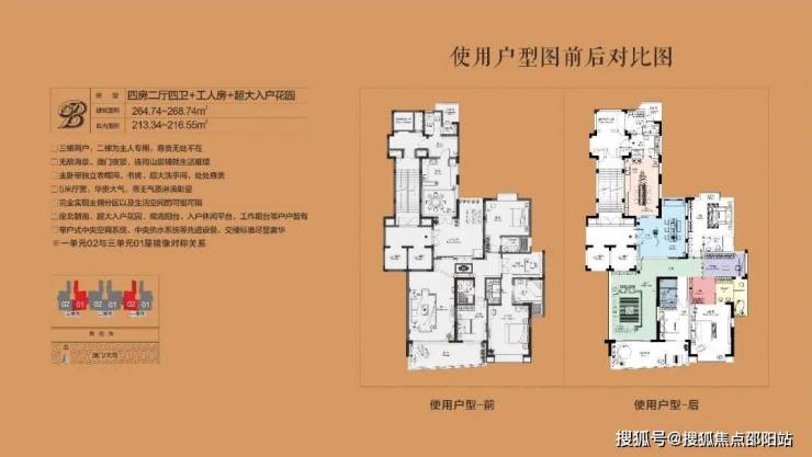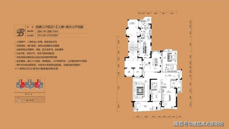 B户型:建面约264.74㎡、四房两厅四卫+工人房+超大入户花园(豪装)