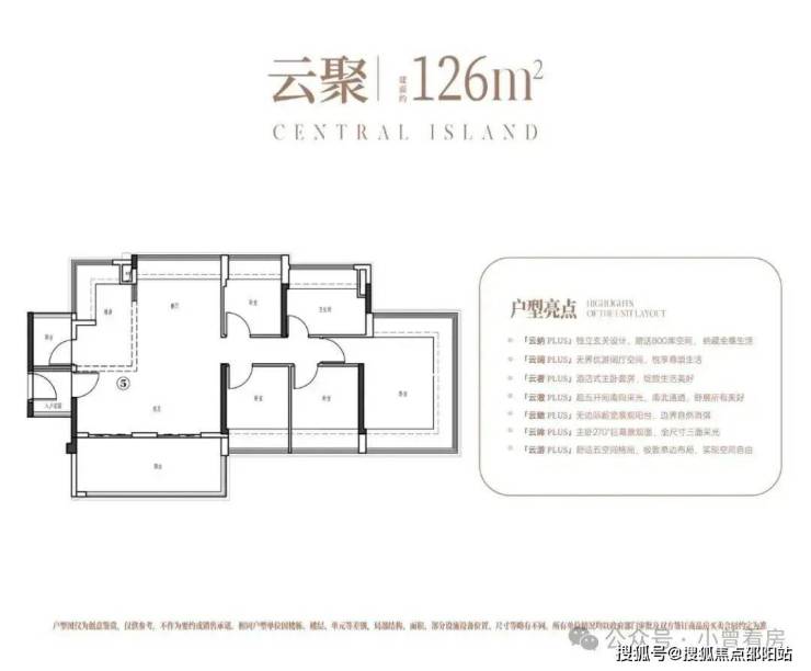 126 平方米的 "4+1" 房作为项目的大户型产品,实际居住感受可与市面上更大面积的户型媲美。该户型阳台采光面宽度达到约 6.2 米,入户玄关处同样预留了 "800 库" 收纳空间。客厅采用 LDKB 一体化设计,厨房为半开放式布局,搭配洄游动线设计,方便家庭成员之间的互动。三个南向卧室的空间尺寸充足,主卧内可容纳 2 米大床、独立衣帽柜和化妆台,同时带有 270 度三面无柱环幕视野,居住舒适度较高。