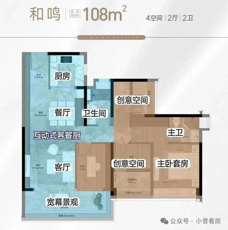 108平方和鸣:(2+2)室2厅2卫,超大阳台