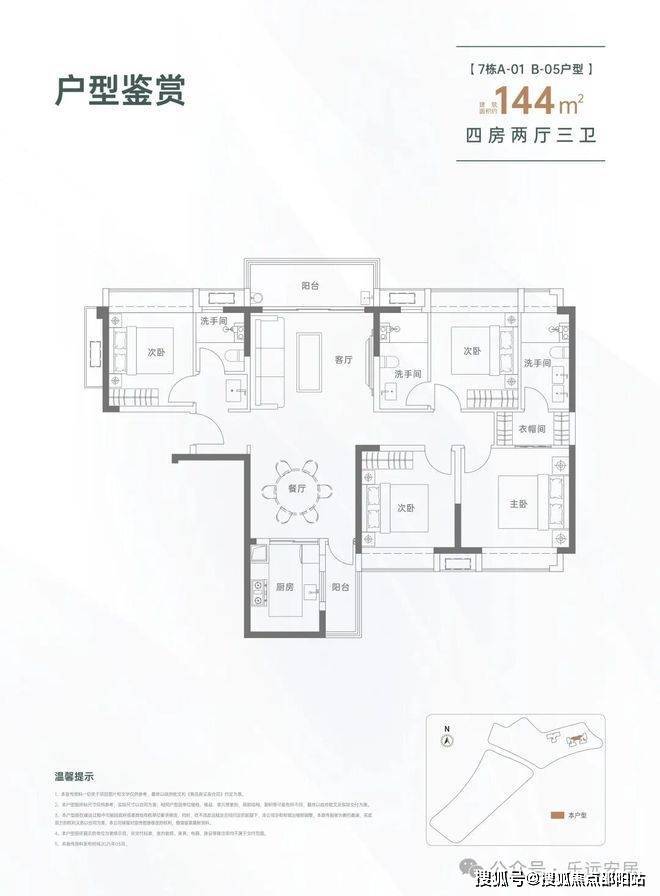 144㎡的4房2厅3卫,设计的是竖厅南北通透格局,进门入户玄关,LDKB一体化设计,双主卧套房,L型厨房还带1个生活阳台,公卫干湿分离,得房率约82%(不含赠送),阳台主朝西北向。