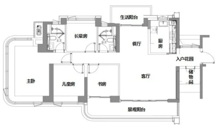 143㎡四房两卫:空间更加阔绰,生活阳台与景观阳台相呼应,增加了空间的通透感。主卧套房设计,配备独立卫生间和储物间,保障主人的私密性和舒适性。