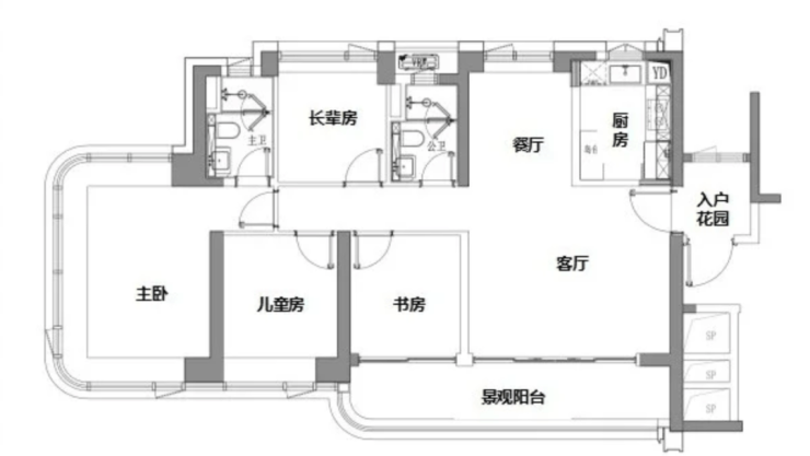 128㎡四房两卫:宽幕观景大宅,户型方正,布局合理。客厅连接景观阳台,采光通风良好,可享受宽幅视野。卧室设计舒适,长辈房、儿童房、书房一应俱全,满足家庭多样化需求。