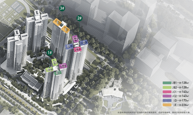3梯4户设计。其中3栋是两梯两户大平层,建面约226平,是设计之都最大的户型。
