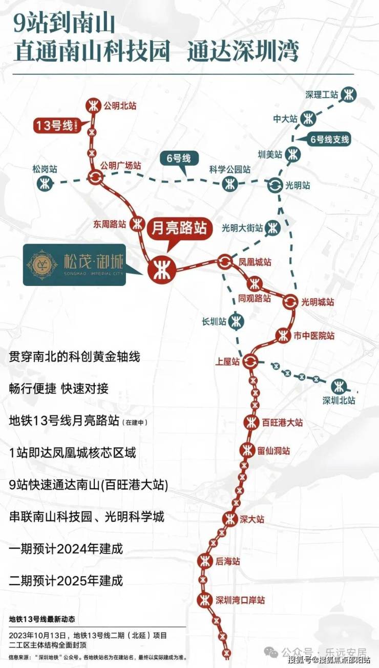 项目坐拥“地铁+主干道+高速”三维交通网络,未来通勤便捷度可期。紧邻在建地铁13号线(黄金科创线)月亮路站,直线距离约400-600米,东周路站约900米,预计2025年底通车后,1站直达凤凰城核心,9站串联南山科技园,30分钟内可速达南山核心区域,一线接驳深圳湾口岸;同时可在凤凰城站换乘6号线,快速通达深圳北站、福田中心区,实现跨区通勤高效衔接。