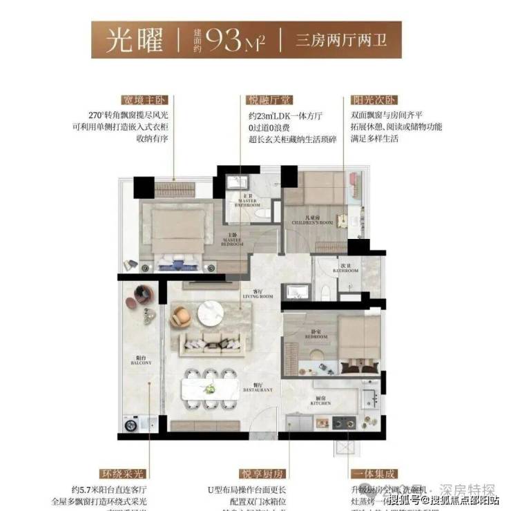 93㎡的3房2厅2卫,2栋1/2/3单元01户型,设计的是横厅南北通透格局,客餐厅5.7米开间,LDK一体化方厅约23平,主卧+次卧270°转角飘窗,U型厨房,公卫三段式干湿分离,得房率约90%(包含赠送),客厅连接餐厅出5.7米长的大阳台,西南或东南朝向。