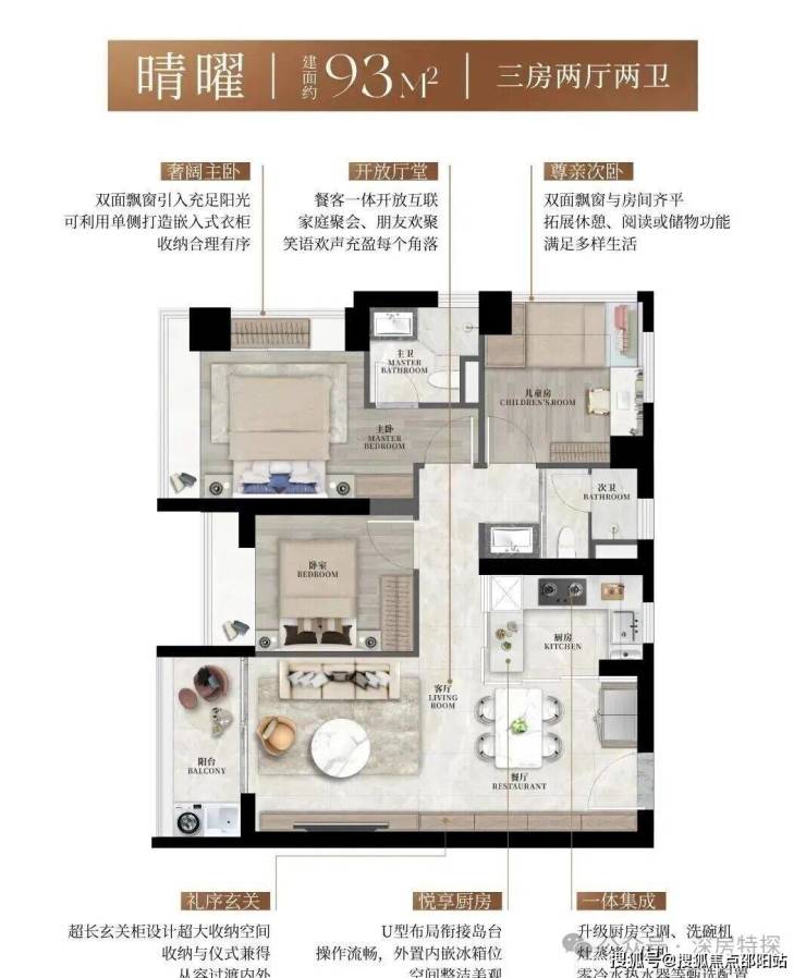93㎡的3房2厅2卫,2栋1/2单元05户型/2栋3单元02户型,设计的是竖厅格局,LDKB一体化设计,动静分区,三开间朝南,主卧+次卧270°转角飘窗,U型厨房,公卫三段式干湿分离,得房率约90%(包含赠送),西南或东南朝向。