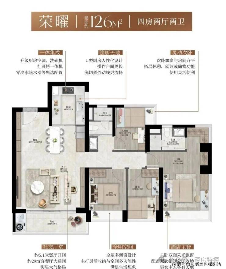 126㎡的4房2厅2卫,设计的是经典竖厅格局,客厅5.1米开间,LDKB一体化设计约29平大方厅,动静分区,四开间朝南,主卧270°转角飘窗,U型厨房,公卫三段式干湿分离,得房率约90%(包含赠送),客厅出5.1米长的大阳台,西南朝向。