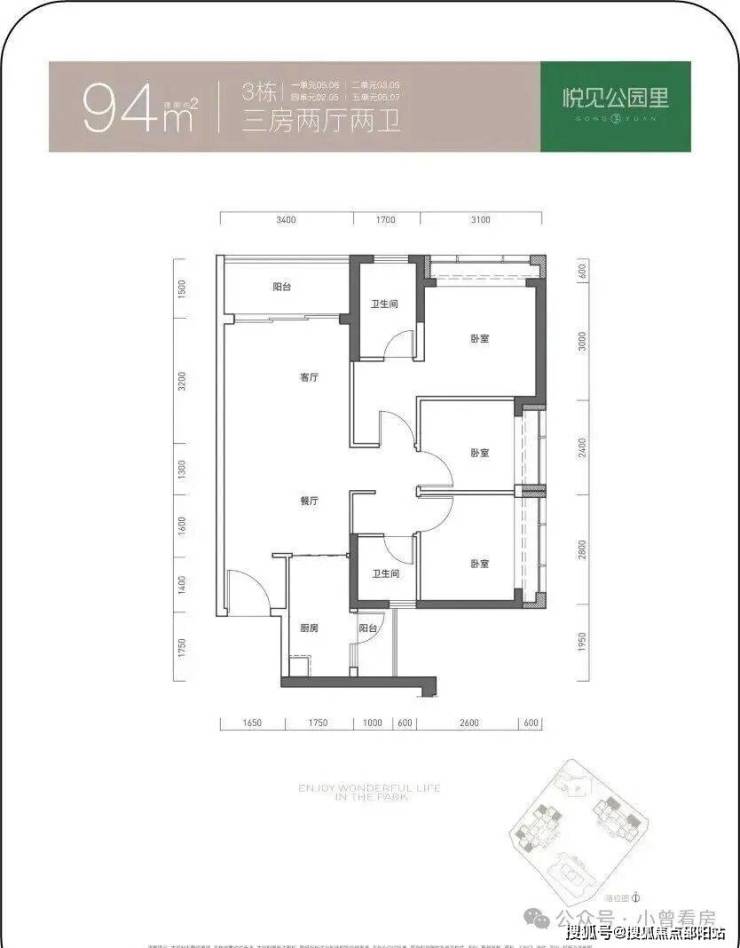 94㎡的3房2厅2卫,设计的是竖厅格局,客厅3.4米开间,LDKB一体化设计,3个卧室分别做到了3.1米/2.8米/2.4米的宽度,L型厨房带1个生活阳台,公卫三段式分离,得房率73.71%(不含赠送),有西北、东北或西南朝向。