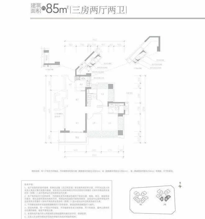 85㎡的3房2厅2卫,设计的经典竖厅格局,客厅3.4米开间,LDKB一体化设计,S墙设计预留冰箱卡槽位,3个卧室分别做到了3.55米/2.6米/2.4米的宽度,U型厨房,公卫三段式分离设计,得房率:79.6%(不含赠送),阳台进深1.8米,有西南或东南朝向。