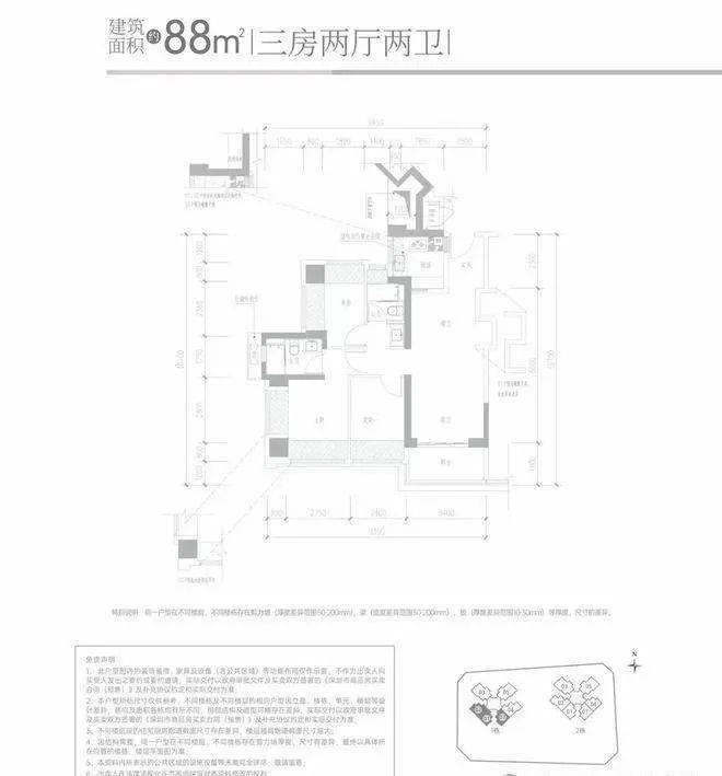 88㎡的3房2厅2卫,设计的经典竖厅格局,客厅3.4米开间,LDKB一体化设计,S墙设计预留冰箱卡槽位,3个卧室分别做到了3.55米/2.6米/2.4米的宽度,U型厨房,公卫三段式分离设计,得房率暂定,低于79.6%(不含赠送),阳台进深1.8米,有西南或东南朝向。