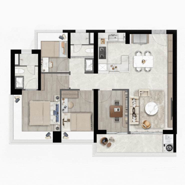 空间的巧思不止于厨房。部分户型中客厅与次卧采用非承重墙隔断,实现了“四居”与“大三居+阔厅”的自由切换。这种可生长的空间结构,让家的格局能伴随孩子的成长、父母的到来而灵活调整,真正实现全生命周期的居住适配。
