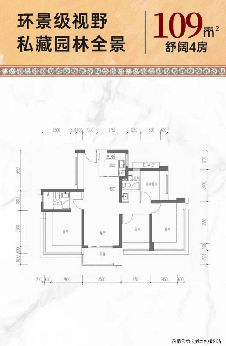 109㎡的4房2厅2卫,竖厅双龙抱珠格局,客厅3.5米开间,主卧270°转角飘窗,分别做到了主卧15.45㎡/次卧13.57㎡/次卧9.31㎡/次卧6.96m²(含墙体飘窗),U型厨房,房率约74%(不含赠送),加上赠送后得房率约89.34%。