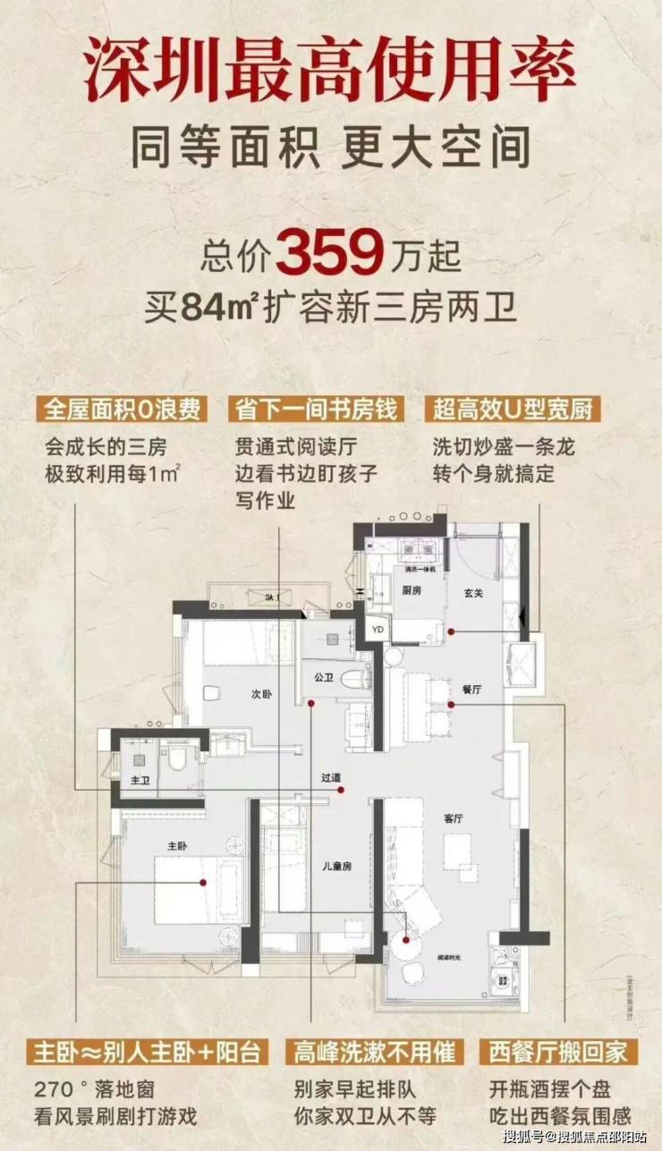 94㎡的3房2厅2卫,竖厅格局,客厅3.4米开间,三开间朝南,分别做到了主卧13.55㎡/次卧9.45㎡/次卧7.28㎡(含墙体飘窗),U型厨房,得房率约74%(不含赠送),加上赠送后得房率约84.22%。