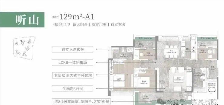 建面约129㎡听山户型,阳光玄关设计,兼容了户内的私密性,储物空间又是全明采光,也符合广东地区对风水的理解,舒适性和实用性都考虑到。