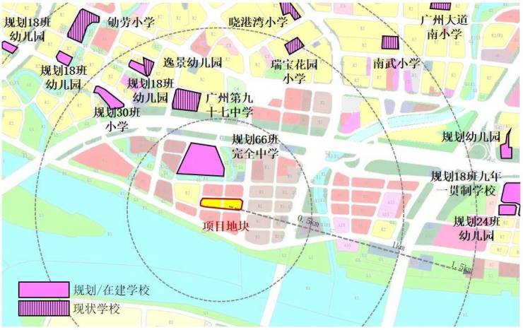1千米范围内有广州第九十七中学,1.5千米范围内有南武小学等,距离地块