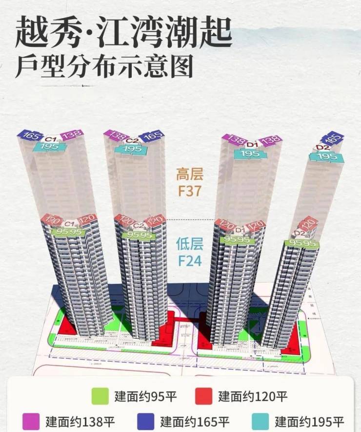 项目共规划4栋住宅楼,均为37层,分高低区设计,而且梯户比跟户型都各不相同: