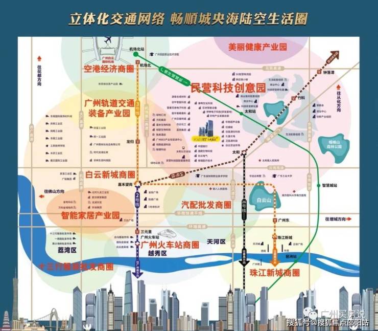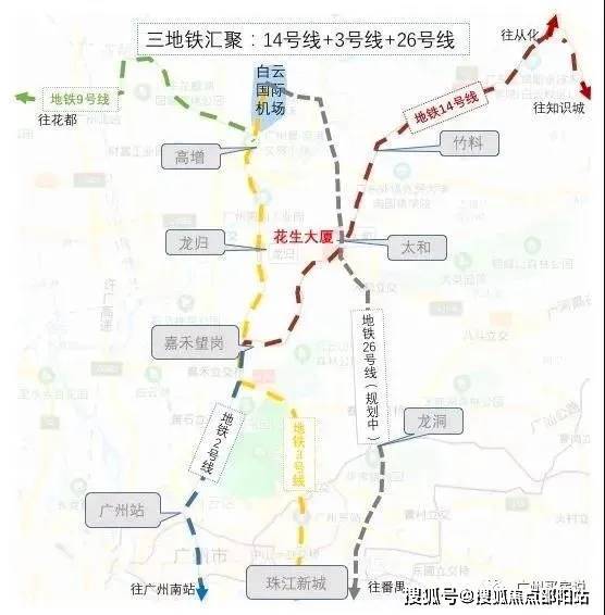 地铁——(三地铁汇聚)地铁14号线太和站3站连接嘉禾望岗及从化,接驳知识城线可往返知识城及增城,接驳地铁2号线可往广州火车站、广州南站等。地铁14号线为广州首次开行快车模式(全程仅30分钟);地铁3号线龙归站可沟通白云国际机场与珠江新城,直达番禺。接驳广州地铁9号线可达花都;地铁26号线沿广州大道南北走向的地铁线路,起始于白云区太和镇,终于番禺区北斗,与3号线平衡线;广佛环线、穗莞深线通车珠三角地区轨道交通同城化,推动广州、佛山、东莞、深圳一小时生活圈。