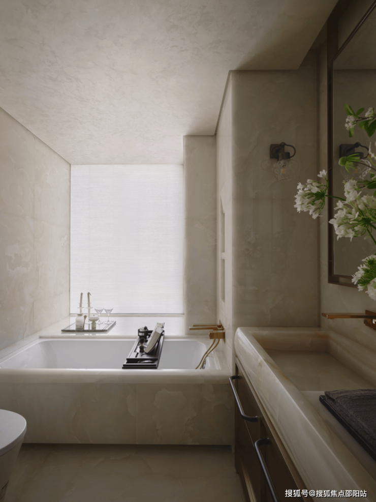 清水玉地面贯穿室内空间,半吨重白玉洗手台整体打磨,使其呈现出淡雅的色泽和岁月的润泽。