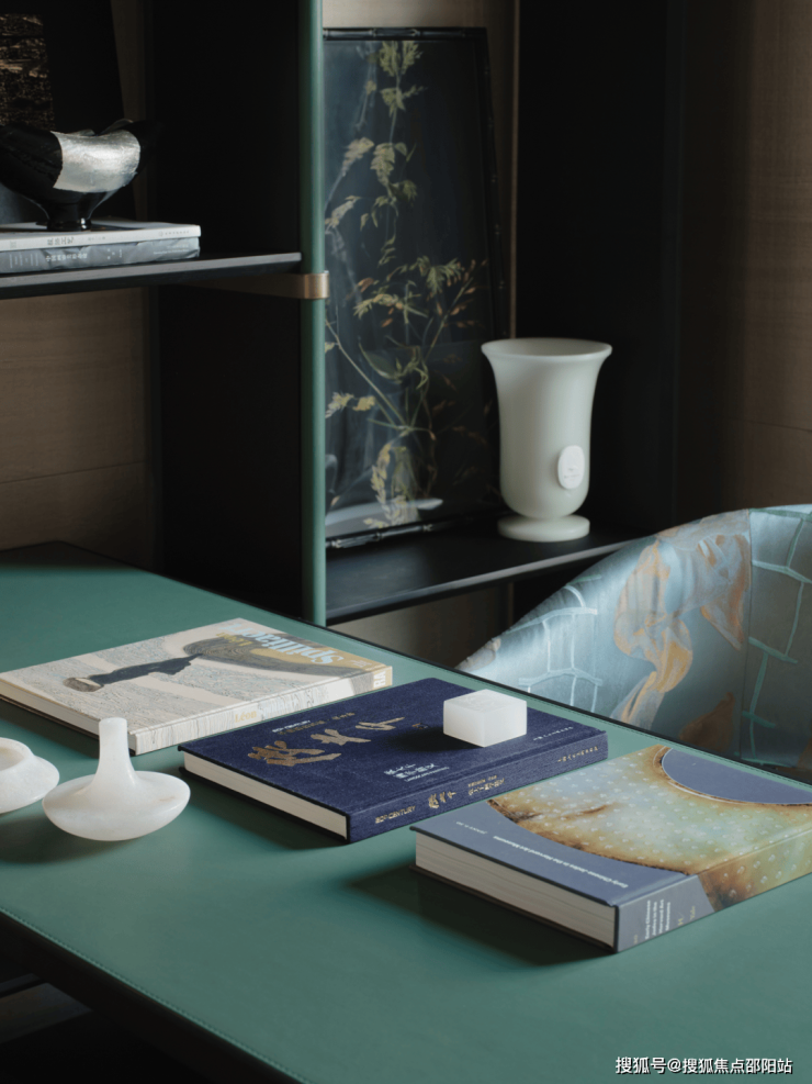 由餐厅踱步书房,动线开朗,纵深有度。柔韧纹理的透光玉石为空间增添温润的氛围,与端雅的青瓷器共同呈现现代和优雅的风格,给人宁谧的感觉。